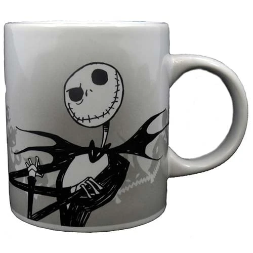 This glass coffee mug features a white color with light grey around the image. On the body of the cup is a scene of Jack Skellington in a graveyard with bats, tombstones, and cats. All the artwork around the body of the mug is a light gray design. Unique in the usual Jack Skellington way, this mug is a must have for that Nightmare Before Christmas lover in your life.