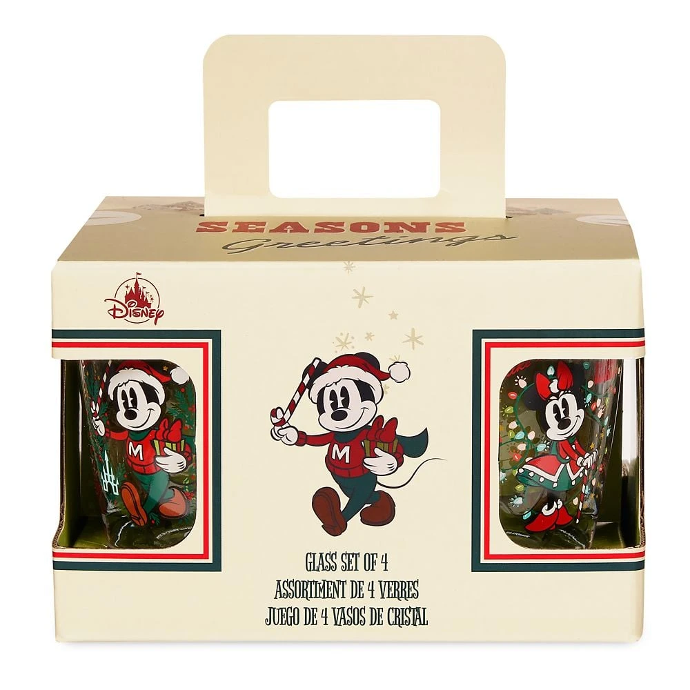 - Each glass includes Holiday-themed artwork of Mickey, Minnie, Pluto, or Goofy