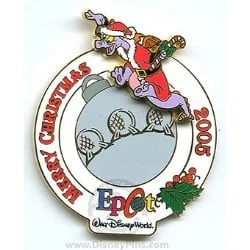This Limited Edition pin features Santa Figment soaring above a holiday tree ornament. Figment is celebrating this festival holiday at Epcot and is a pin-on-pin. This pin will be presented on a unique, red stocking gift card holder.