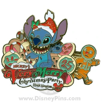 Stitch enjoys some holiday treats in Limited Edition pin created especially for Mickey’s Very Merry Christmas Party 2008. This pin features Stitch’s head as a movable element.