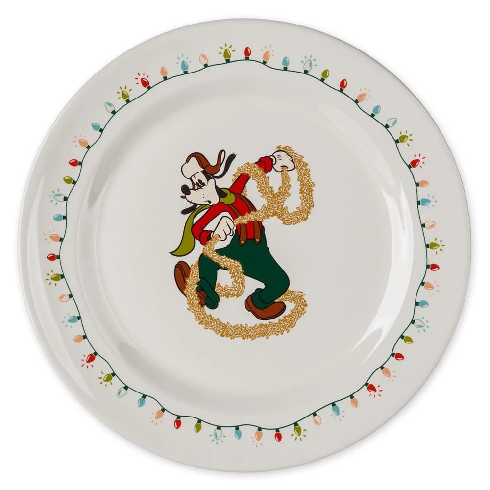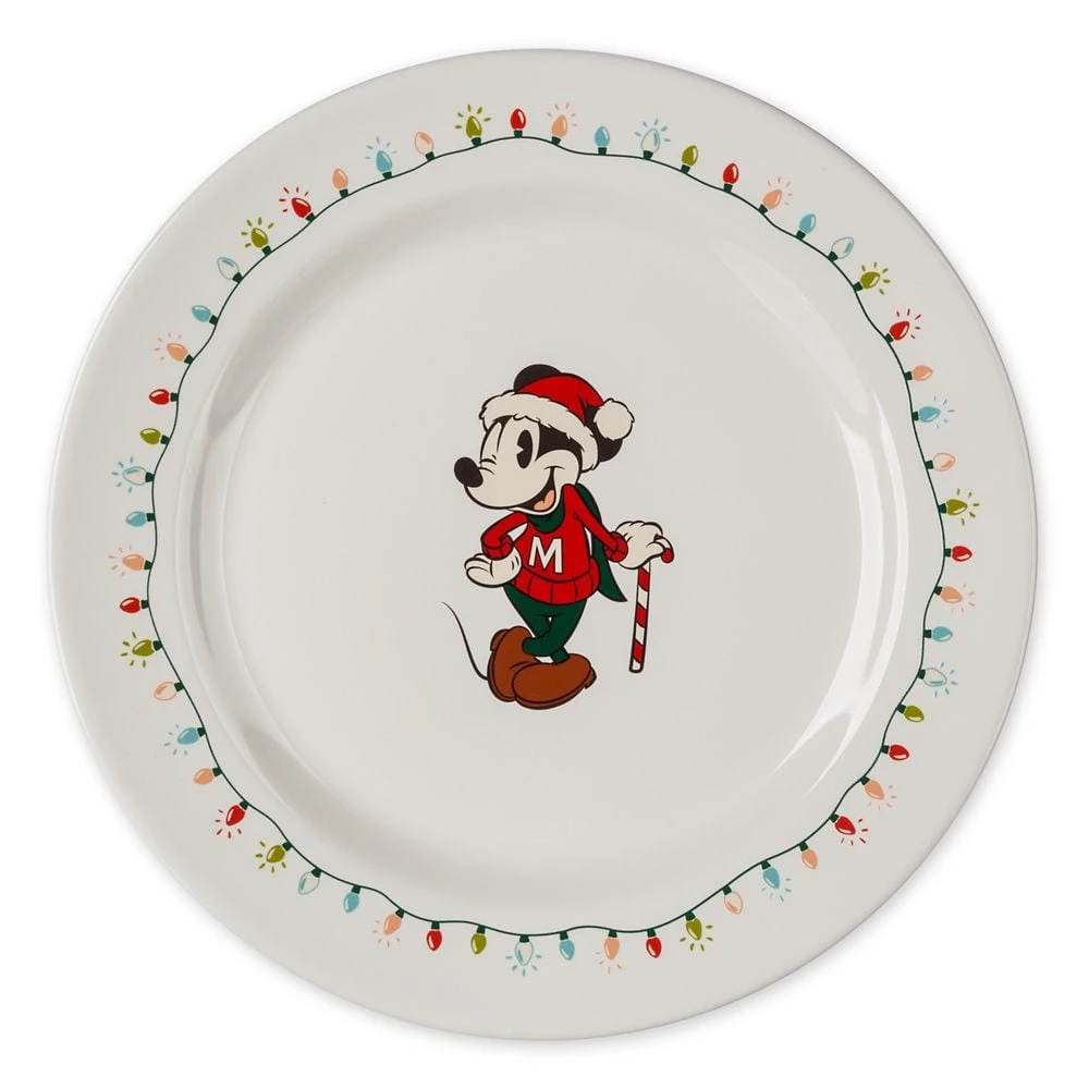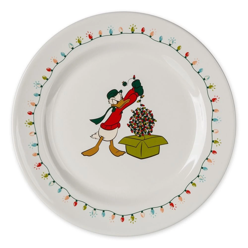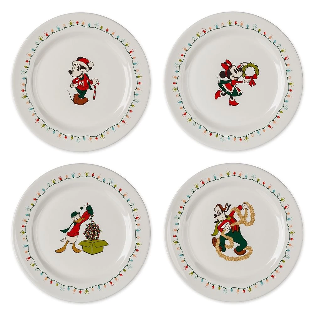 - Holiday themed artwork of Mickey, Minnie, Donald, and Goofy with colorful string light lining on each plate