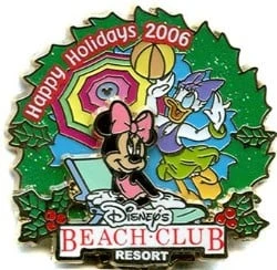 This Limited Edition pin features Minnie and Daisy celebrating the holidays at Disney’s Beach Club Resort. Minnie is featured as a pin on pin.