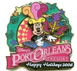 This Limited Edition pin features Minnie as a pin on pin celebrating the holidays at Disney’s Port Orleans Resort.