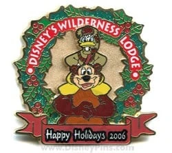This Limited Edition pin features Donald Duck and a friendly bear as a pin on pin celebrating the holidays at Disney’s Wilderness Lodge.