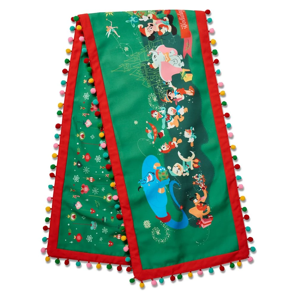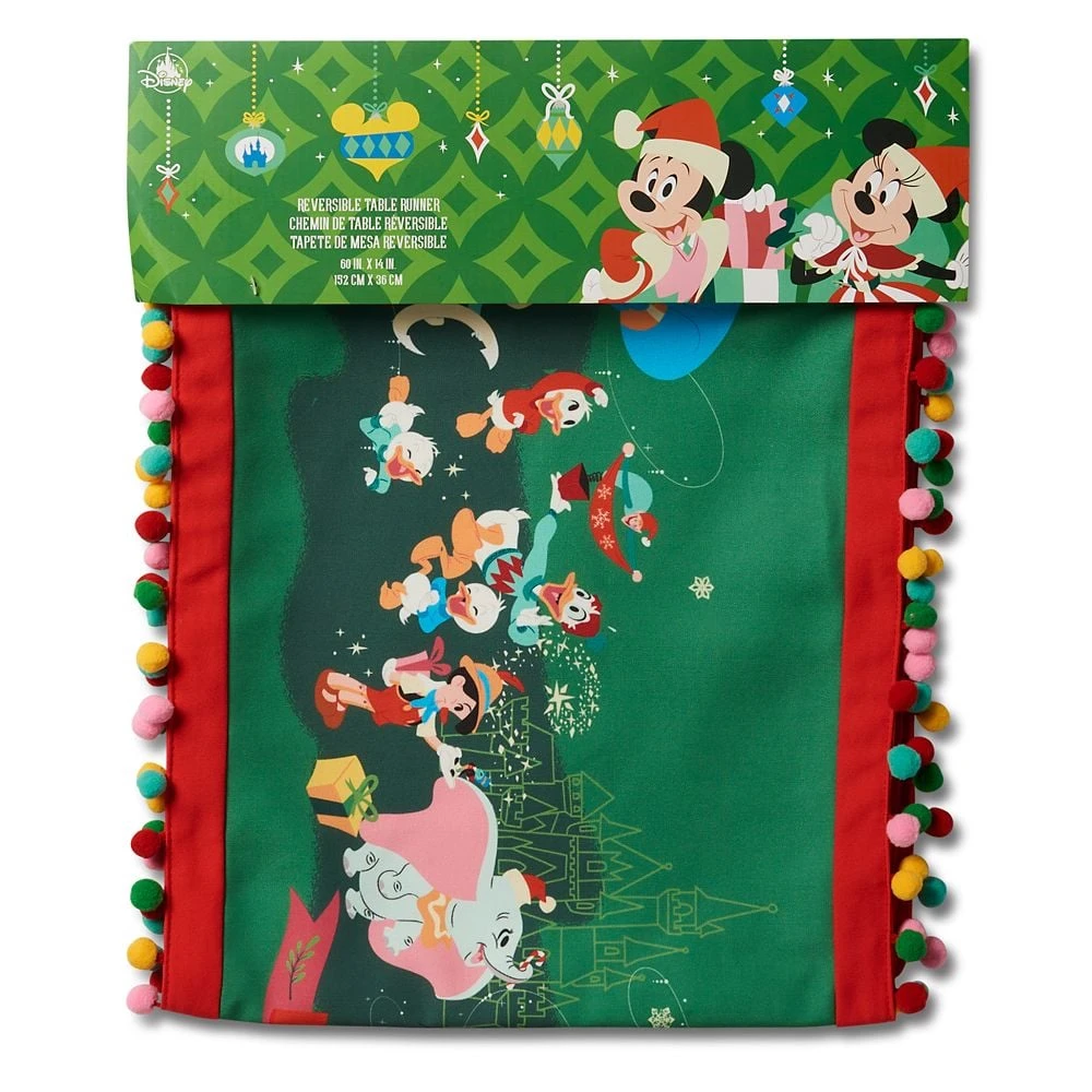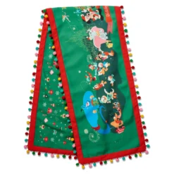 Share the joy of Christmas with loved ones while decking the halls with delightful Disney characters and this reversible fabric table runner. A merry Santa Mickey and his friends share a magical holiday scene on one side while a decorative ornament icon pattern fills the reverse, plus pom pom trim.