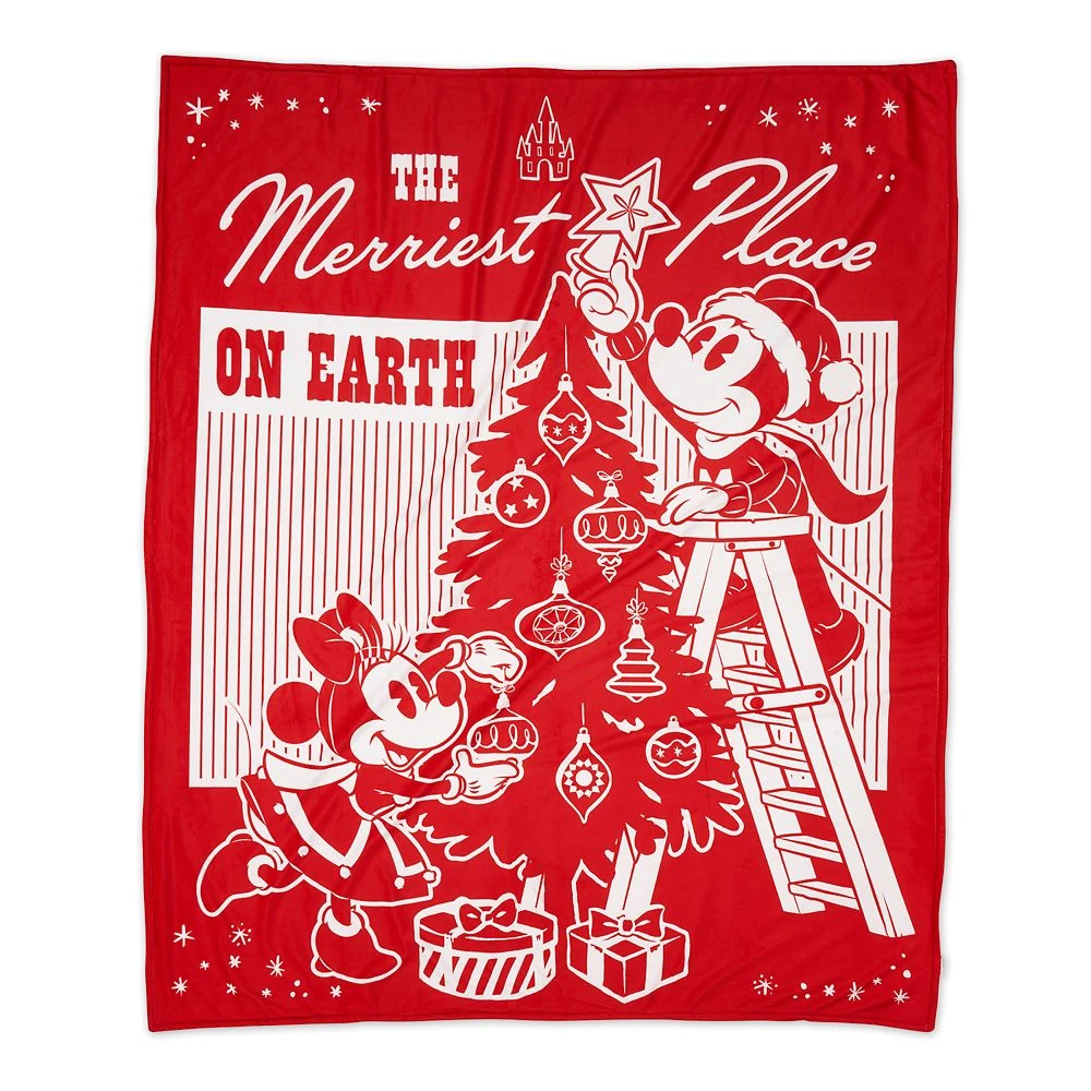 Share holiday cheer with loved ones while snuggling through the season under this fuzzy fleece throw blanket with Mickey and Minnie Mouse print.