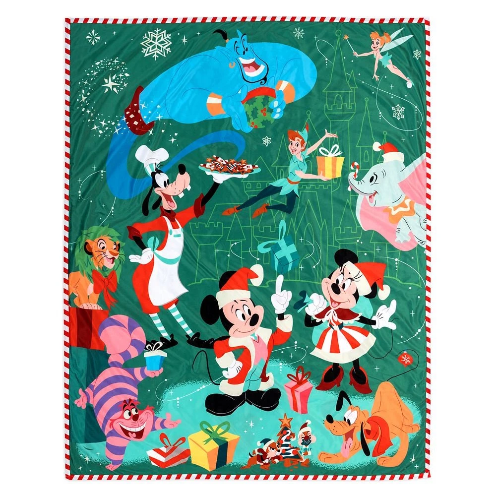 Share the warmth of the holidays with loved ones while snuggling through the season under this reversible fuzzy fleece throw blanket with a merry Mickey and friends scene on one side and decorative ornament icon pattern on the other, plus candy stripe trim.