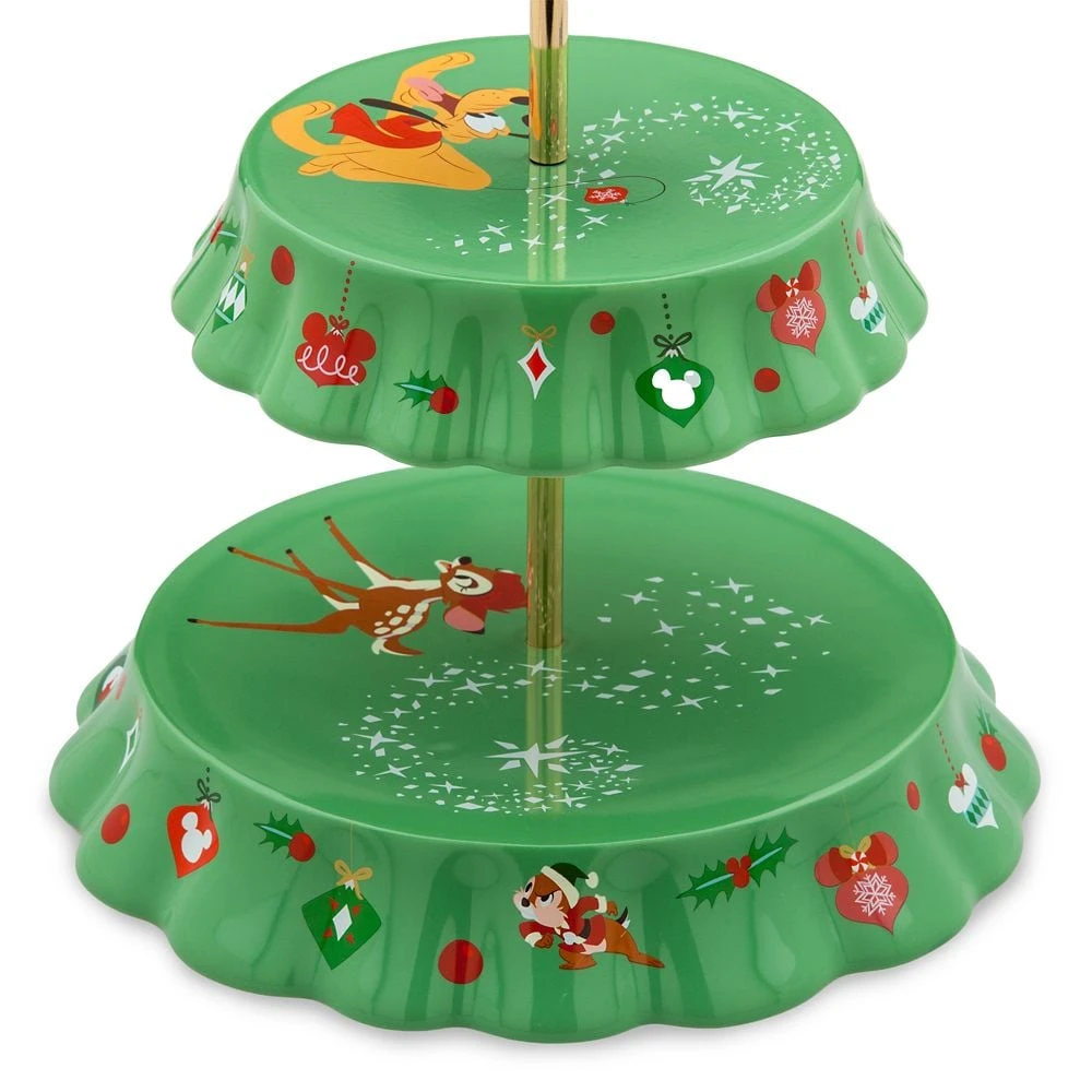 Provide meal times with a taste of the holidays with this festive tray that will deliver tiers of joy. The Christmas tree design, featuring ceramic tiers set around a central goldtone metal post with star, includes colorful artwork of popular Disney characters and holiday decorations!