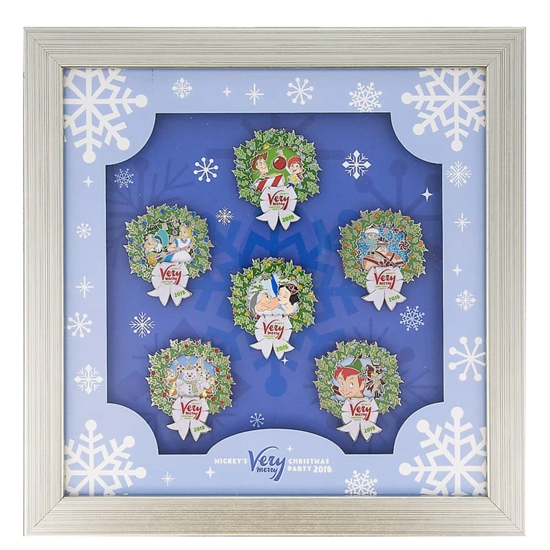 Every year there are special pins released for Mickey’s Very Merry Christmas Party. This is the complete Framed Set. The set will include the Alice & Mad Hatter pin, the Ralph and Vanelope pin, the Chip & Dale pin, the Peter Pan and Tinkerbell pin, the Woody and Jessie, and the Snow White and Grumpy completer pin.