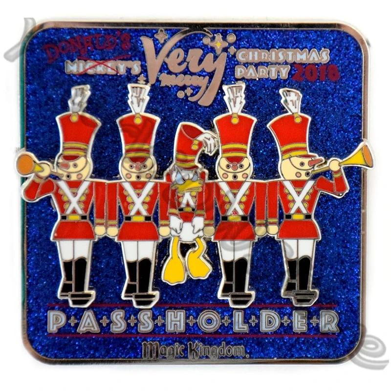 Every year there are special pins released for Mickey’s Very Merry Christmas Party. This is the PASSHOLDER pin . It features Donald Duck and the Toy Soldiers. It reads Donald’s Very Merry Christmas Party 2018.