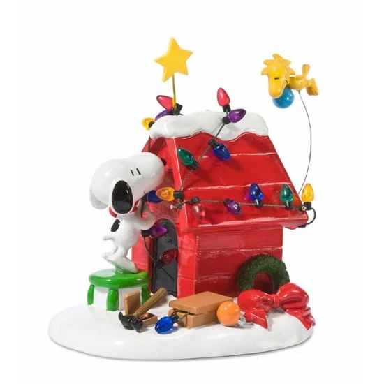 Snoopy and Woodstock are getting into the holiday spirit and are decorating Snoopy’s doghouse. They are sure to win 1st prize at the decorating contest! Coordinates with Charlie Brown House or any building in the Peanuts collection.